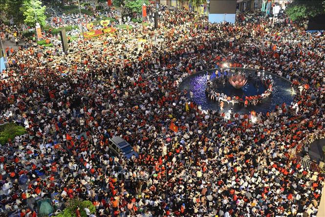 Hàng ngàn người dân tập trung tại ngã tư Lê Lợi - Nguyễn Huệ, Quận 1 để theo dõi Lễ kỷ niệm. Ảnh: Mạnh Linh/TTXVN