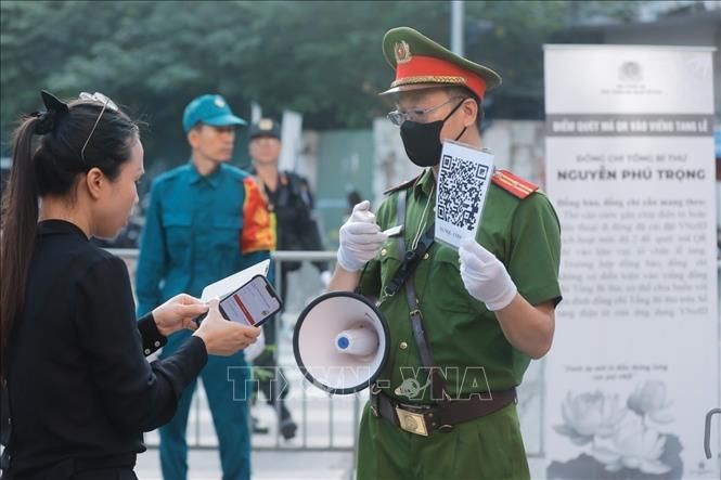 Lực lượng công an hỗ trợ, hướng dẫn người dân cài đặt ứng dụng VNeID, quét mã QR khi vào viếng Tổng Bí thư Nguyễn Phú Trọng. Ảnh: Minh Quyết/TTXVN