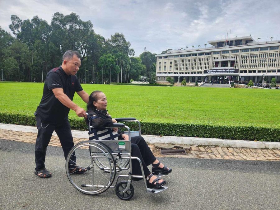 Trong dòng người chờ vào viếng Tổng Bí thư Nguyễn Phú Trọng tại Hội trường Thống Nhất (TP Hồ Chí Minh) sáng 26/7, có nhiều cụ lớn tuổi không tự đi được, phải nhờ người nhà đẩy xe lăn. Trong ảnh: Người nhà đưa bà Nguyễn Khánh Nam (80 tuổi, ngụ quận Tân Bình) vào viếng Tổng Bí thư Nguyễn Phú Trọng. Ảnh: Mạnh Linh - Hoàng Tuyết/Báo Tin tức