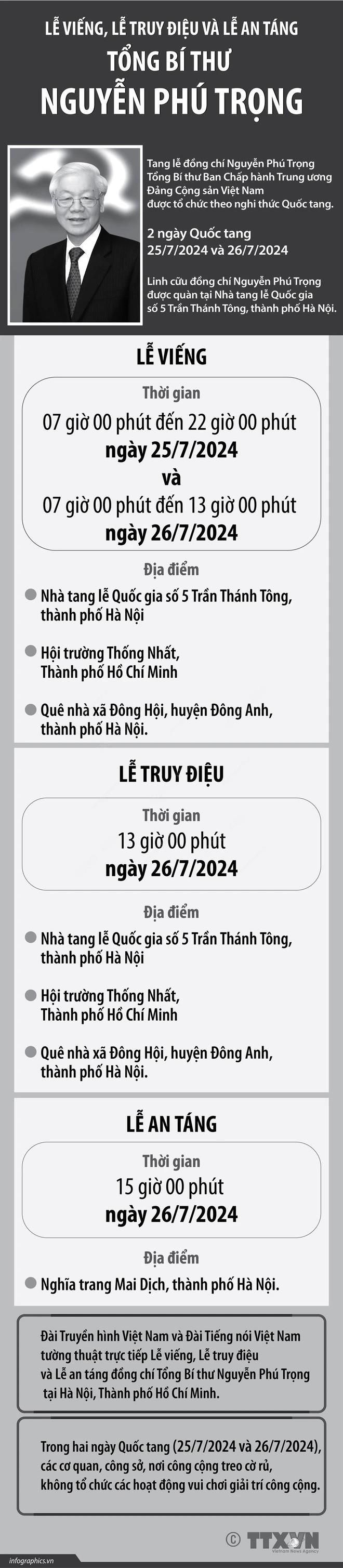 Lễ viếng đồng chí Nguyễn Phú Trọng được tổ chức tại Nhà tang lễ Quốc gia số 5, Trần Thánh Tông, TP Hà Nội, bắt đầu từ 7 giờ đến 13 giờ ngày 26/7.