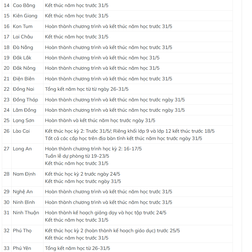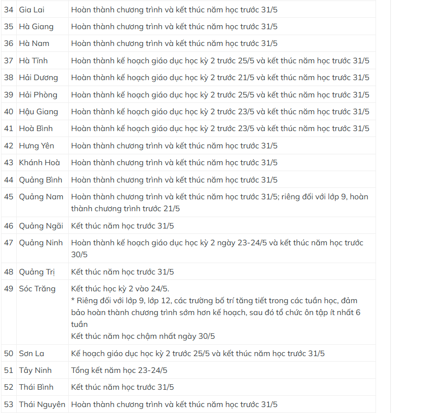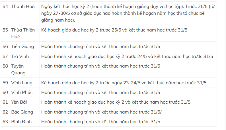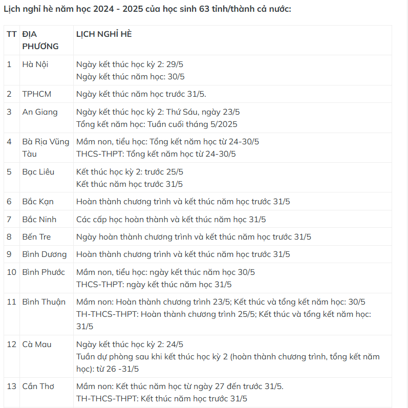 Tùy vào thời gian kết thúc học kỳ 1, học sinh ở một số địa phương có thể được nghỉ hè sớm hơn 1 tuần. Theo đó, Hà Tĩnh hoàn thành kế hoạch giáo dục học kỳ 2 trước 25/5 và kết thúc năm học trước 31/5. Trong khi ngày kết thúc năm học của học sinh Hà Nội là 30/5; TP Hồ Chí Minh trước 31/5; An Giang kết thúc học kỳ 2 vào 23/5 và việc tổng kết năm học diễn ra vào tuần cuối tháng 5 tùy từng trường…