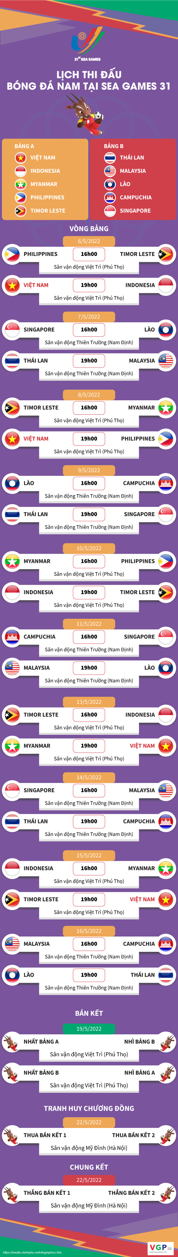 * Lưu ý: Nếu Đội tuyển Việt Nam vào bán kết, trận bán kết có sự góp mặt của đội chủ nhà sẽ diễn ra lúc 19 giờ ngày 18/5