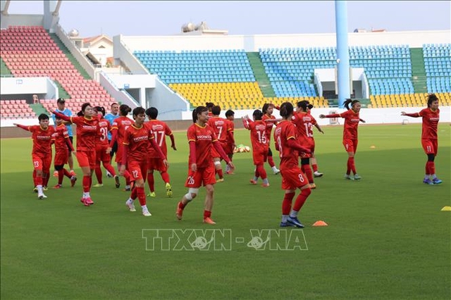 Đội tuyển bóng đá nữ Việt Nam tập luyện tại Sân vận động Cẩm Phả, Quảng Ninh. Ảnh: TTXVN.