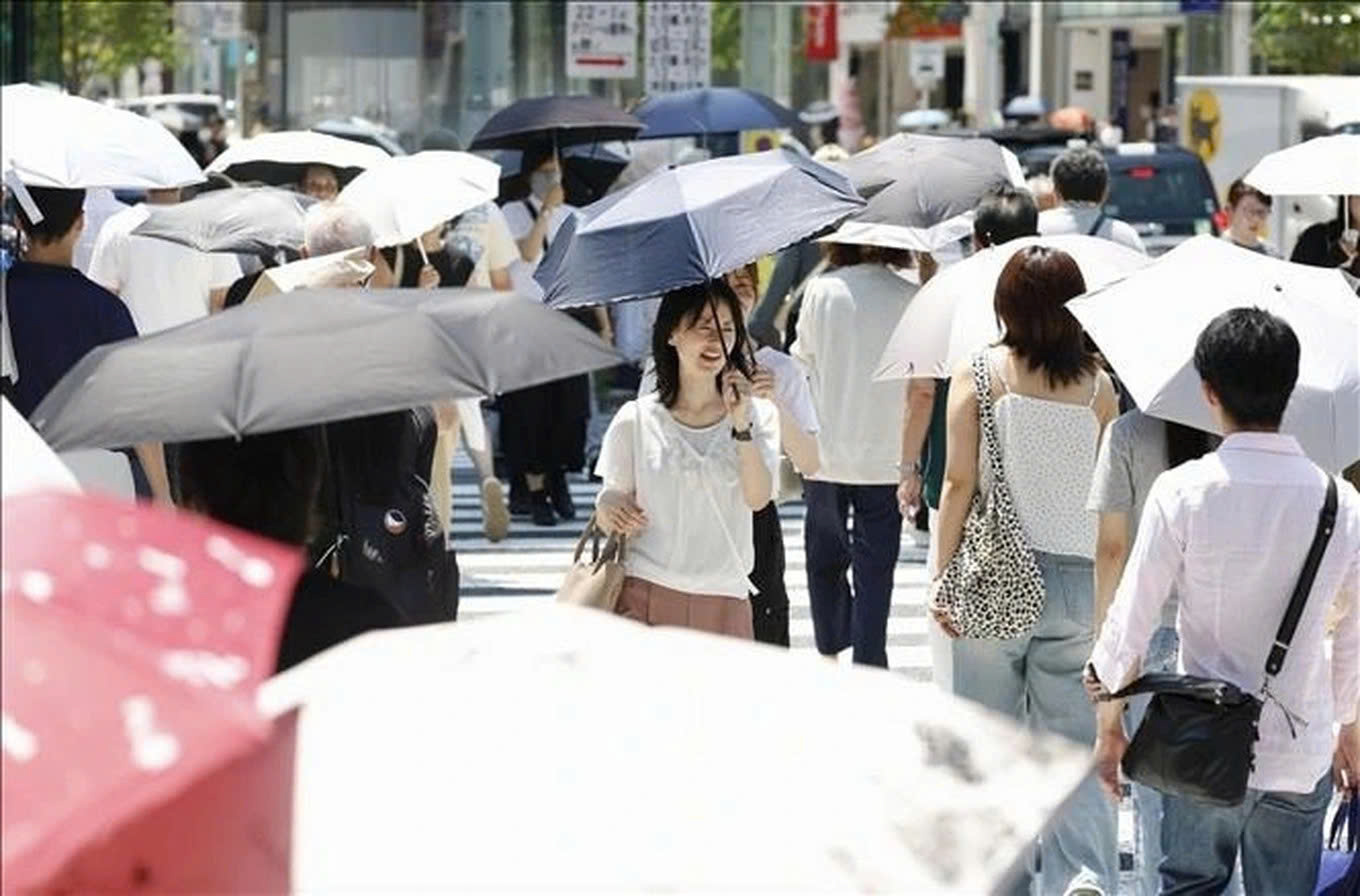 Người dân di chuyển dưới trời nắng gắt tại Ginza, Nhật Bản hôm 23/7 (Ảnh: Kyodo).
