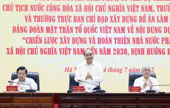 Sáng 14/7, tại Hà Nội, Chủ tịch nước Nguyễn Xuân Phúc, Trưởng Ban chỉ đạo xây dựng Đề án "Chiến lược xây dựng và hoàn thiện Nhà nước pháp quyền xã hội chủ nghĩa Việt Nam đến năm 2030, định hướng đến năm 2045” chủ trì buổi làm việc của Thường trực Ban Chỉ đạo với Đảng đoàn Mặt trận Tổ quốc Việt Nam.