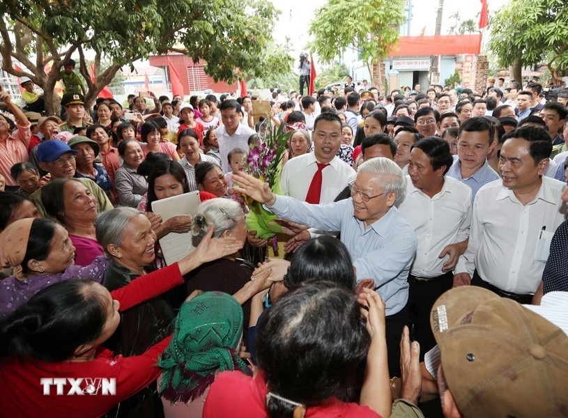 Việc Đảng và Nhà nước trao tặng Huân chương Sao Vàng cho Tổng Bí thư là sự ghi nhận của Đảng, Nhà nước và nhân dân đối với những công lao, đóng góp to lớn, đặc biệt xuất sắc của đồng chí Tổng Bí thư đối với sự nghiệp Cách mạng của Đảng, của dân tộc. Trong ảnh: Tổng Bí thư Nguyễn Phú Trọng với nhân dân xã Tây An, huyện Tiền Hải, Thái Bình. (Ảnh: Trí Dũng/TTXVN)