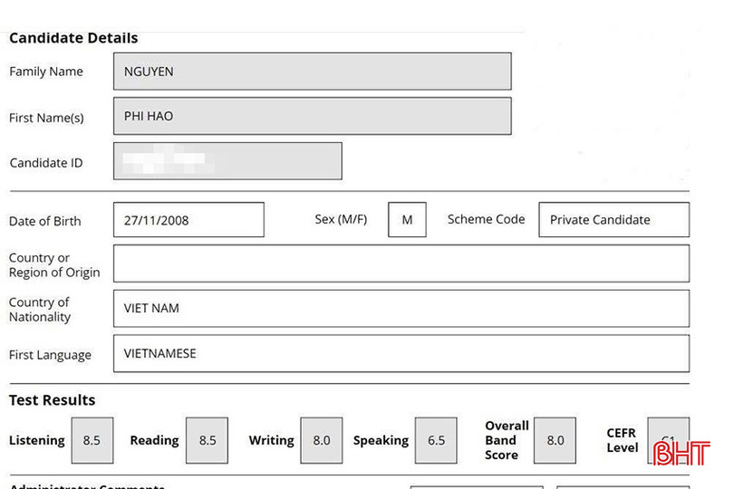 Nam sinh Nguyễn Phi Hào vừa đạt IELTS 8.0 điểm. Với việc đạt 8.0 IELTS (nghe 8.5; điểm đọc 8.5; điểm viết 8.0 và điểm nói 6.5), em Nguyễn Phi Hào đã tạo dấu ấn nổi