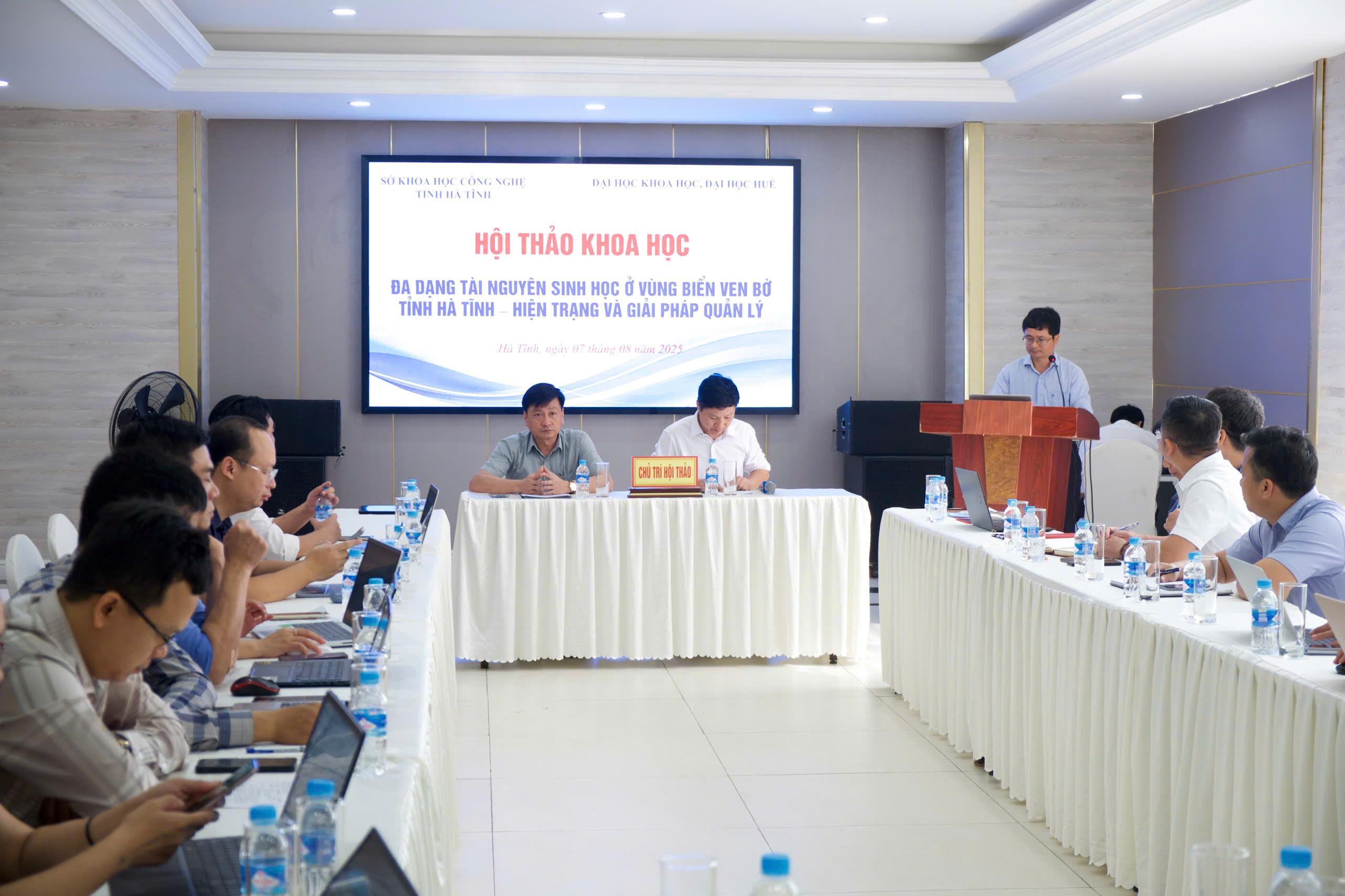 Chủ trì Hội thảo có ông Bùi Phong An, PGĐ Sở Khoa học & Công nghệ Hà Tĩnh và ông Nguyễn Văn Huy, PGS.TS Phó Trưởng khoa Thuỷ sản - Trường ĐH Khoa học, ĐH Huế