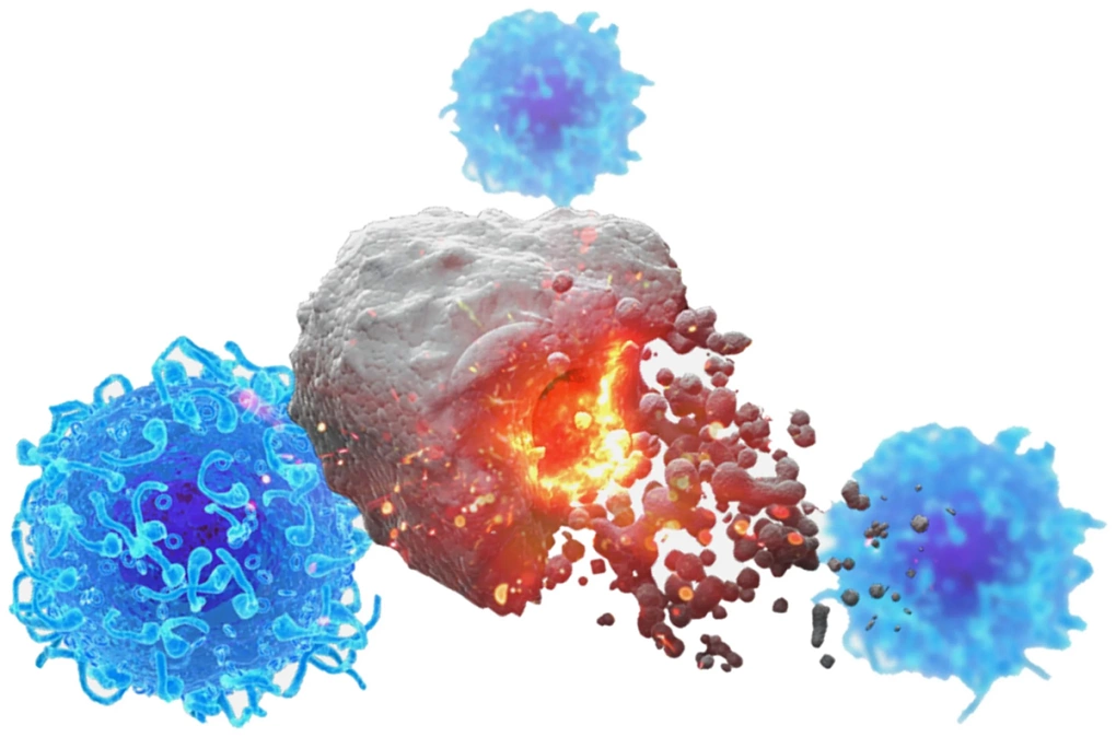 Mô phỏng tế bào T (màu xanh) đang tấn công và phá vỡ một tế bào ung thư. Ảnh: Yu Zhao