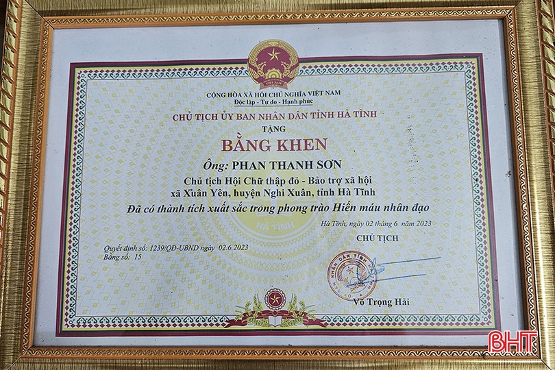 Năm 2023, anh Sơn được Chủ tịch UBND tỉnh tặng bằng khen vì có thành tích xuất sắc trong thực hiện phong trào hiến máu tình nguyện.