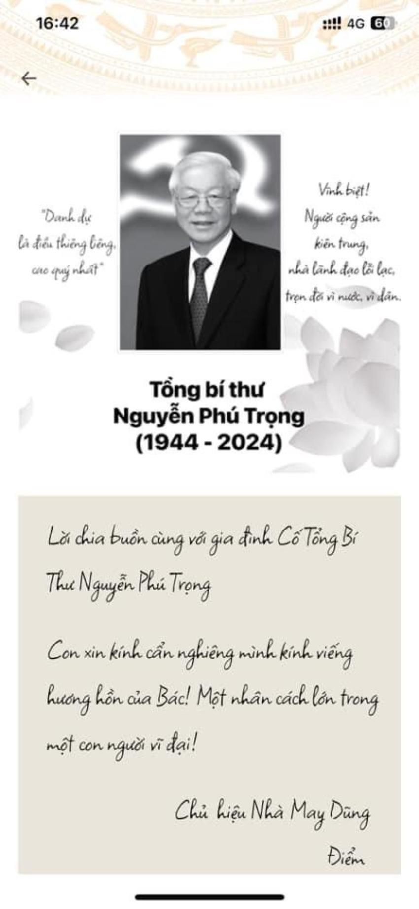 Hình ảnh của Tổng Bí thư Nguyễn Phú Trọng sẽ sống mãi trong lòng mỗi người dân Việt Nam và bạn bè thế giới! Những giá trị mà Tổng Bí thư để lại sẽ được các thế hệ gìn giữ và phát huy. Thành kính biết ơn Tổng Bí thư Nguyễn Phú Trọng - một trí thức lớn, một tài năng lớn, một nhân cách lớn!