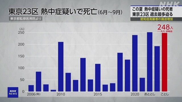Văn phòng Giám định Y tế Thủ đô Tokyo cho biết, trong mùa Hè này, Nhật Bản đã trải qua đợt nắng nóng kỷ lục, làm ảnh hưởng nghiêm trọng đến sức khỏe của người dân. Chỉ tính riêng trong khoảng thời gian 3 tháng, từ tháng 6 - 8/2024 vừa qua, đã có ít nhất 248 trường hợp được xác nhận tử vong do say nắng tại 23 phường của Thủ đô Tokyo. Con số này vượt xa con số 192 ca tử vong trong 4 tháng - từ tháng 06 - 09 năm ngoái và cũng gần chạm mức cao kỷ lục năm 2022 với 251 trường hợp, con số cao nhất kể từ năm 2006.