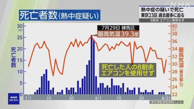 Theo chính quyền Tokyo, số ca tử vong do say nắng bắt đầu tăng nhanh kể từ sau ngày 03/07, khi nắng nóng ở trung tâm Tokyo đạt mức kỷ lục. Đặc biệt, ngày 29/07, ước tính có 26 ca tử vong khi nắng nóng ở mức cảnh báo nguy hiểm và vượt quá 40 độ C ở phía Bắc khu vực Kanto, nhiệt độ cao nhất ở trung tâm Tokyo cũng lên tới 37,3 độ C. Trong tháng 8, nhiệt độ tại Tokyo tiếp tục ở mức cảnh báo nguy hiểm và hầu như ngày nào cũng có trường hợp tử vong do say nắng, tuy nhiên con số này không cao như đợt cuối tháng 7 trước đó.