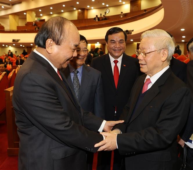 Tổng Bí thư, Chủ tịch nước Nguyễn Phú Trọng và Thủ tướng Nguyễn Xuân Phúc dự bế mạc Hội nghị. Ảnh: Trí Dũng /TTXVN