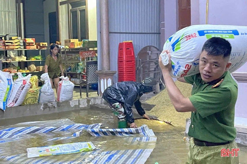 Lực lượng công an hỗ trợ người dân xã Thạch Ngọc (Thạch Hà) di dời tài sản đến nơi an toàn. Ảnh Công thông tin Công an tỉnh.