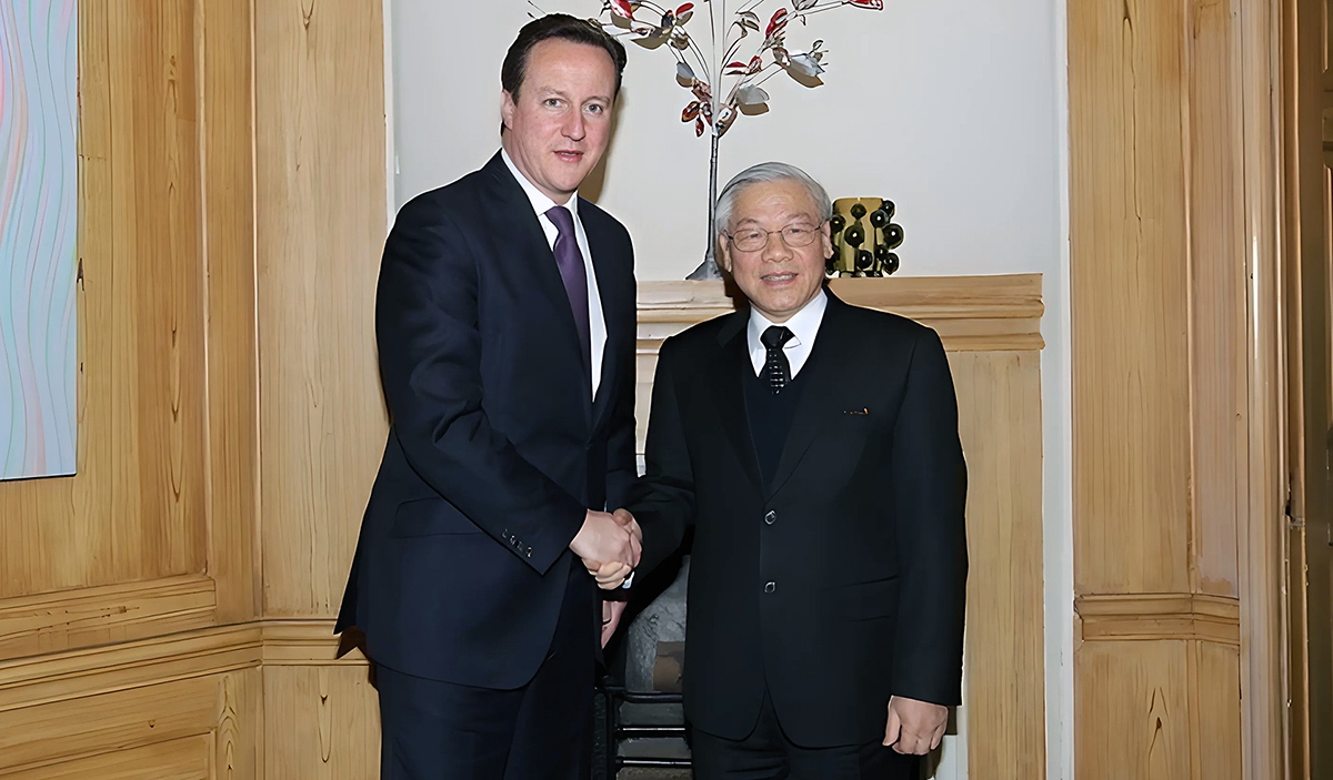 Ngày 22 và 23/1/2013, Tổng Bí thư Nguyễn Phú Trọng đã có chuyến thăm chính thức tới Vương quốc Anh. Đây là chuyến thăm chính thức đầu tiên của một Tổng Bí thư Đảng Cộng sản Việt Nam tới Vương quốc Anh, đánh dấu kỷ niệm 40 năm thiết lập quan hệ ngoại giao Việt Nam - Vương quốc Anh, 20 năm hoạt động của Hội đồng Anh và Bộ Phát triển quốc tế Anh tại Việt Nam và 3 năm thiết lập quan hệ Đối tác Chiến lược giữa Việt Nam và Vương quốc Anh. Trong ảnh: Thủ tướng Anh David Cameron đón Tổng Bí thư Nguyễn Phú Trọng tại số 10 phố Downing ở Thủ đô London. Ảnh TTXVN