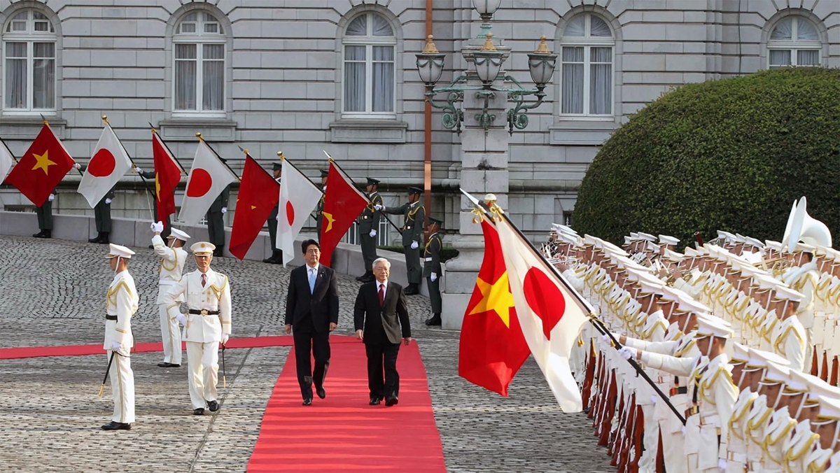 Chuyến thăm chính thức Nhật Bản đầu tiên trên cương vị Tổng Bí thư của Tổng Bí thư Nguyễn Phú Trọng diễn ra vào trung tuần tháng 9/2015 sau khi Việt Nam và Nhật Bản nâng cấp quan hệ lên quan hệ đối tác chiến lược sâu rộng vì hòa bình và phồn vinh ở châu Á năm 2014. Ảnh: TTXVN