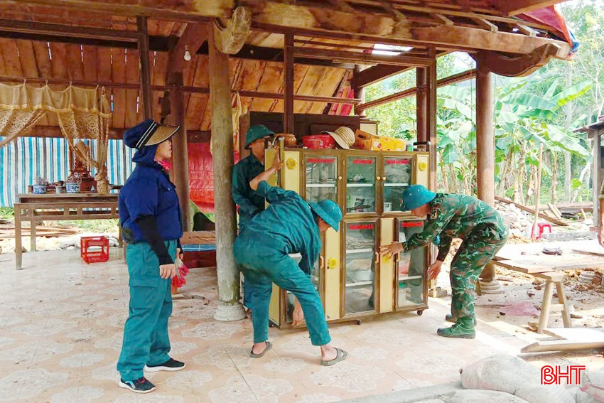 Cán bộ, chiến sĩ ở Ban CHQS huyện Hương Khê và dân quân xã Phú Gia di dời đồ gia dụng để giúp bà Phạm Thị Hường xây nhà mới.