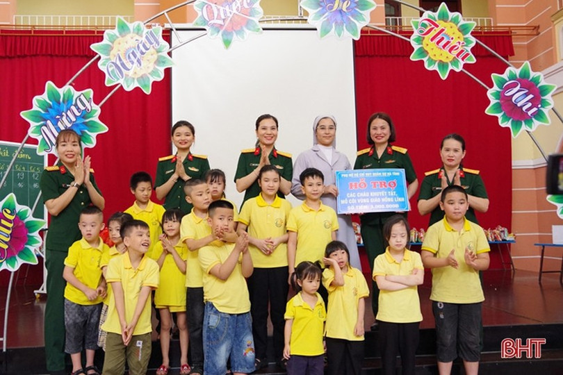 Các nữ quân nhân tặng quà cho các cháu ở Trung tâm Hỗ trợ phát triển giáo dục hoà nhập trẻ khuyết tật Hồng Lĩnh.