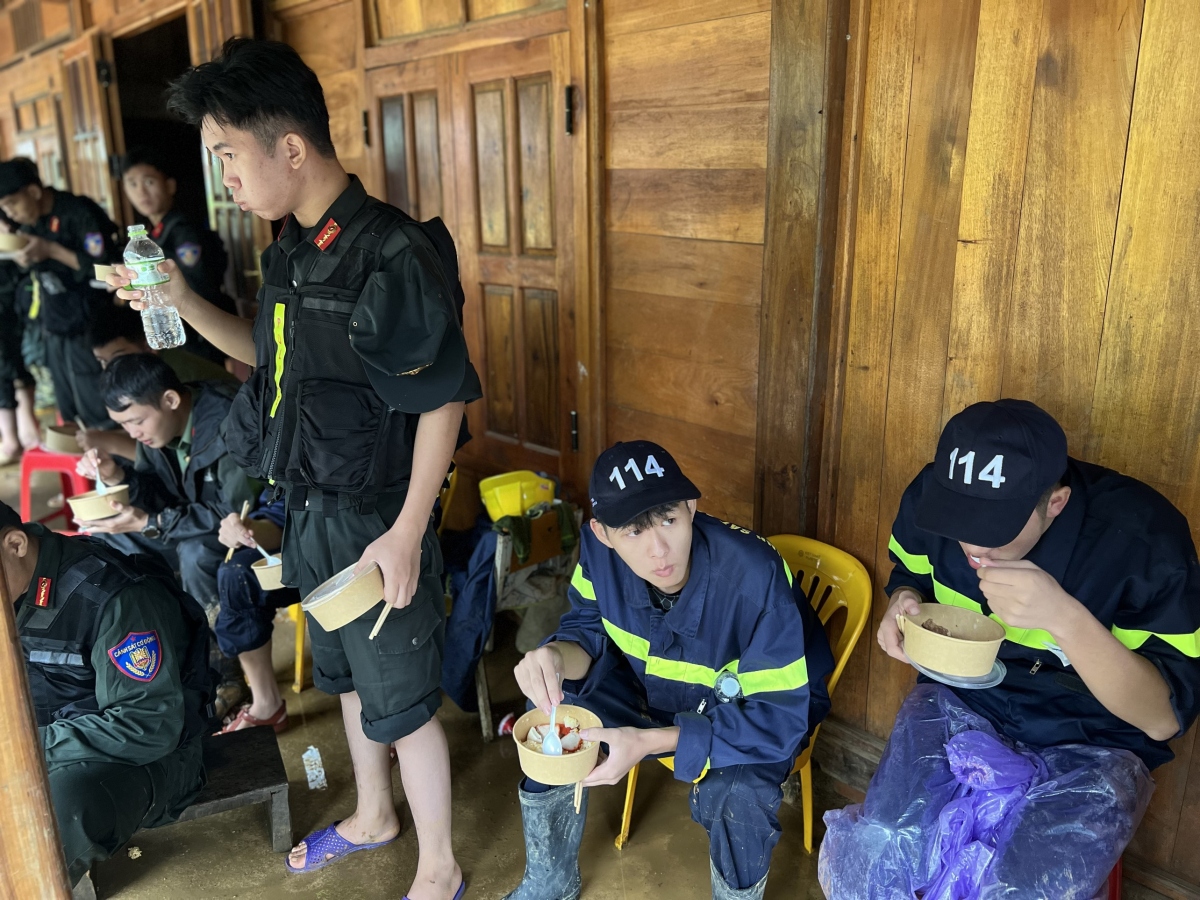 Những bữa cơm vội vàng của các cán bộ chiến sĩ công an Cao Bằng trực tiếp tham gia cứu nạn cứu hộ tại xã Ca Thành, huyện Nguyên Bình.
