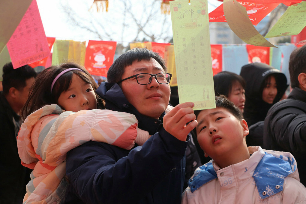 Một ông bố ở dẫn các con đi hội chợ ở Sơn Đông, ngày 12/2. Ảnh: AFP