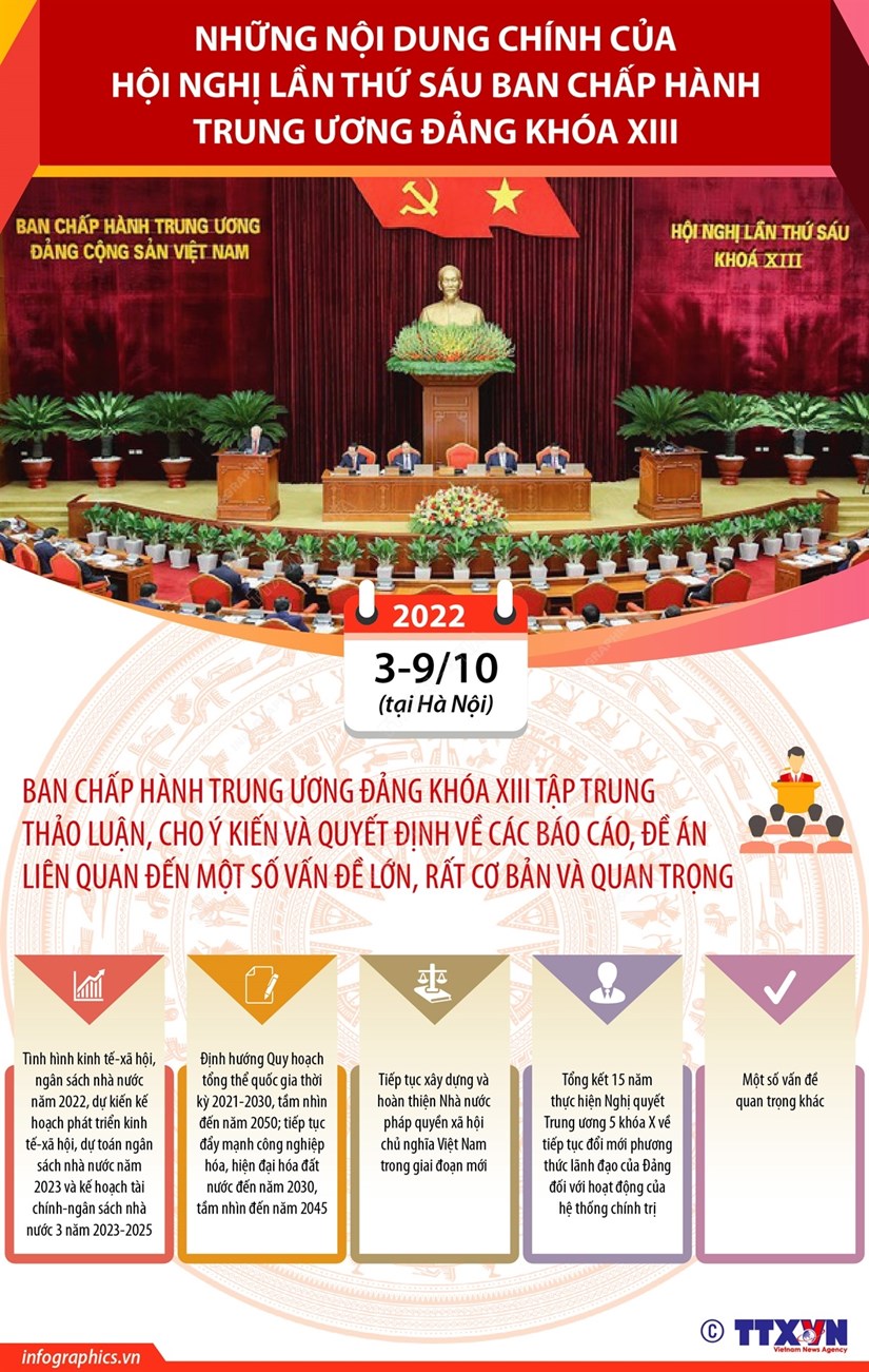 Sáng 3/10/2022, Hội nghị lần thứ sáu Ban Chấp hành Trung ương Đảng khóa XIII đã khai mạc trọng thể tại Thủ đô Hà Nội. Hội nghị Trung ương lần này nhằm hoàn thành về