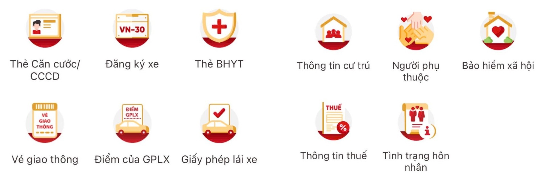 Với định danh mức 1 trên VNeID, người dân có thể khai báo y tế lẫn tiêm chủng. Với mức 2, ứng dụng có thể tích hợp nhiều giấy tờ quan trọng để sử dụng thay bản cứng, gồm căn cước công dân, giấy tạm trú, tạm vắng, giấy phép lái xe, đăng ký xe, mã số bảo hiểm xã hội, người phụ thuộc, tình trạng hôn nhân.