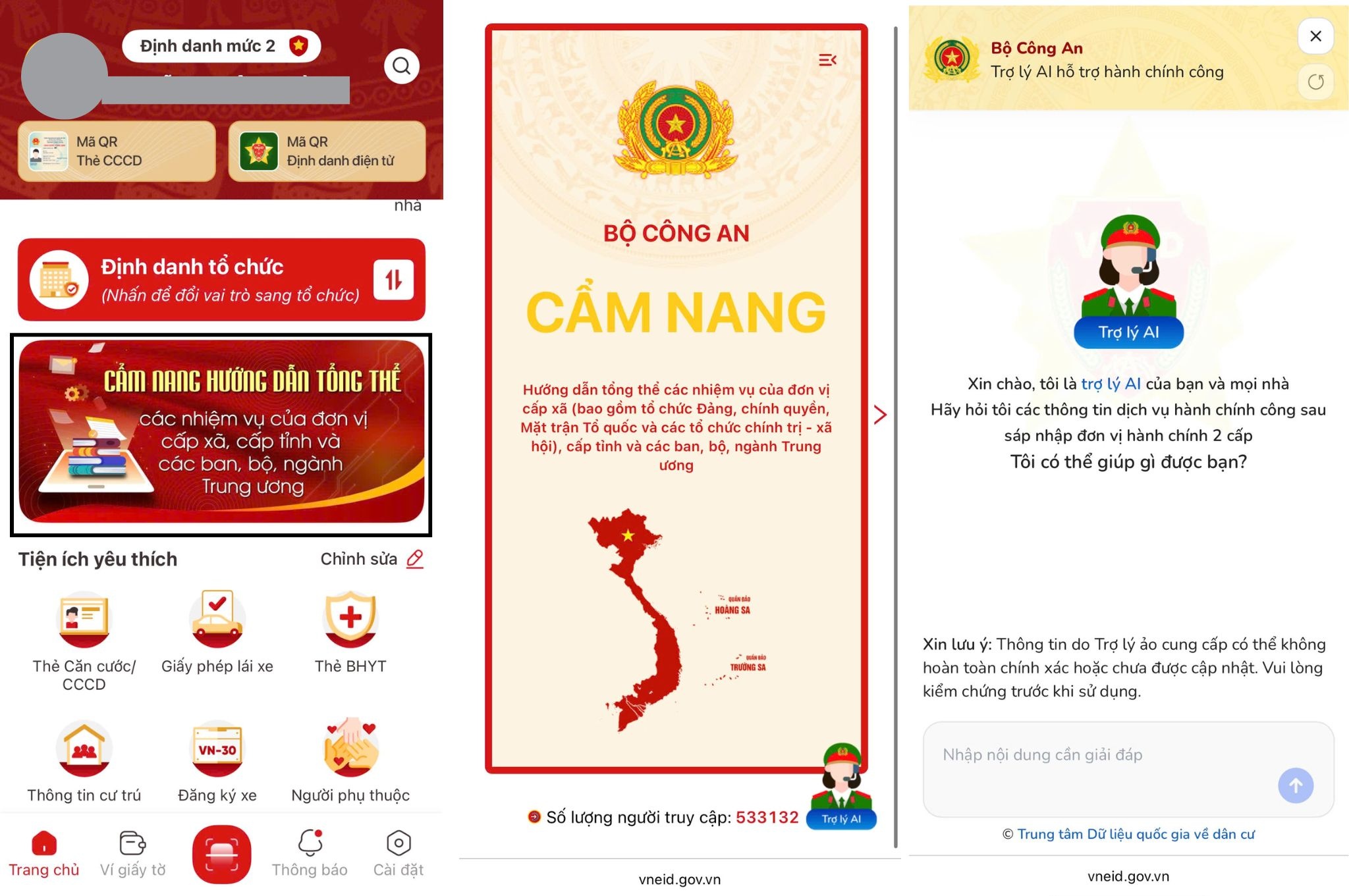 Thời gian qua lãnh đạo Bộ Công an phối hợp với đơn vị liên quan xây dựng Cẩm nang hướng dẫn tổng thể các nhiệm vụ của đơn vị cấp xã, cấp tỉnh và các ban, bộ, ngành Trung ương trên VNeID có tích hợp trợ lý ảo AI.