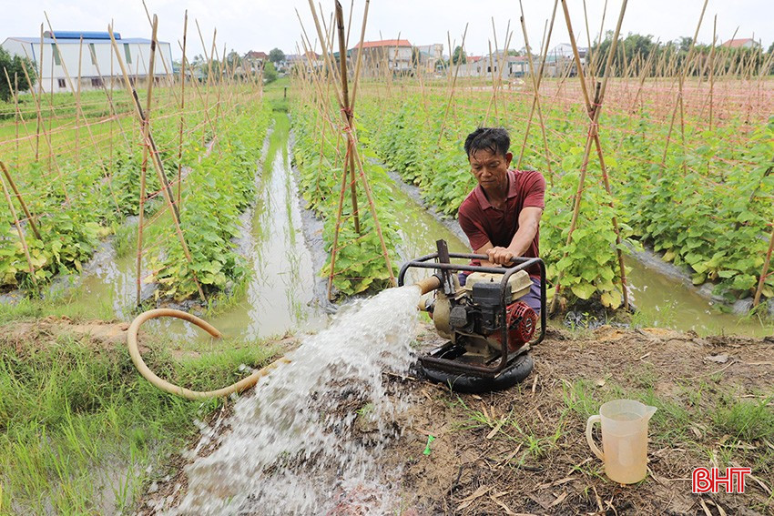 Chiều 18/9, tranh thủ trời ngớt mưa, ông Lê Hữu Xuân (thôn Thọ, xã Thạch Liên, Thạch Hà) ra ruộng để bơm thoát nước với hi vọng cứu được lứa dưa chuột đang đợt thu hoạch.