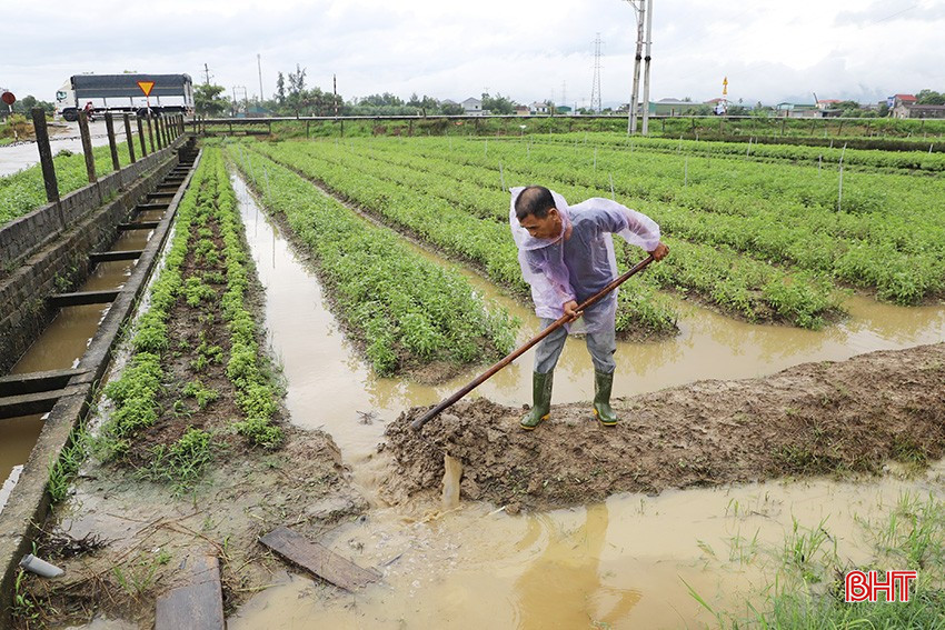 Tại làng rau gia vị La Xá (xã Tân Lâm Hương, Thạch Hà), bà con cũng đang khẩn trương thoát nước để rau không bị ngập úng.