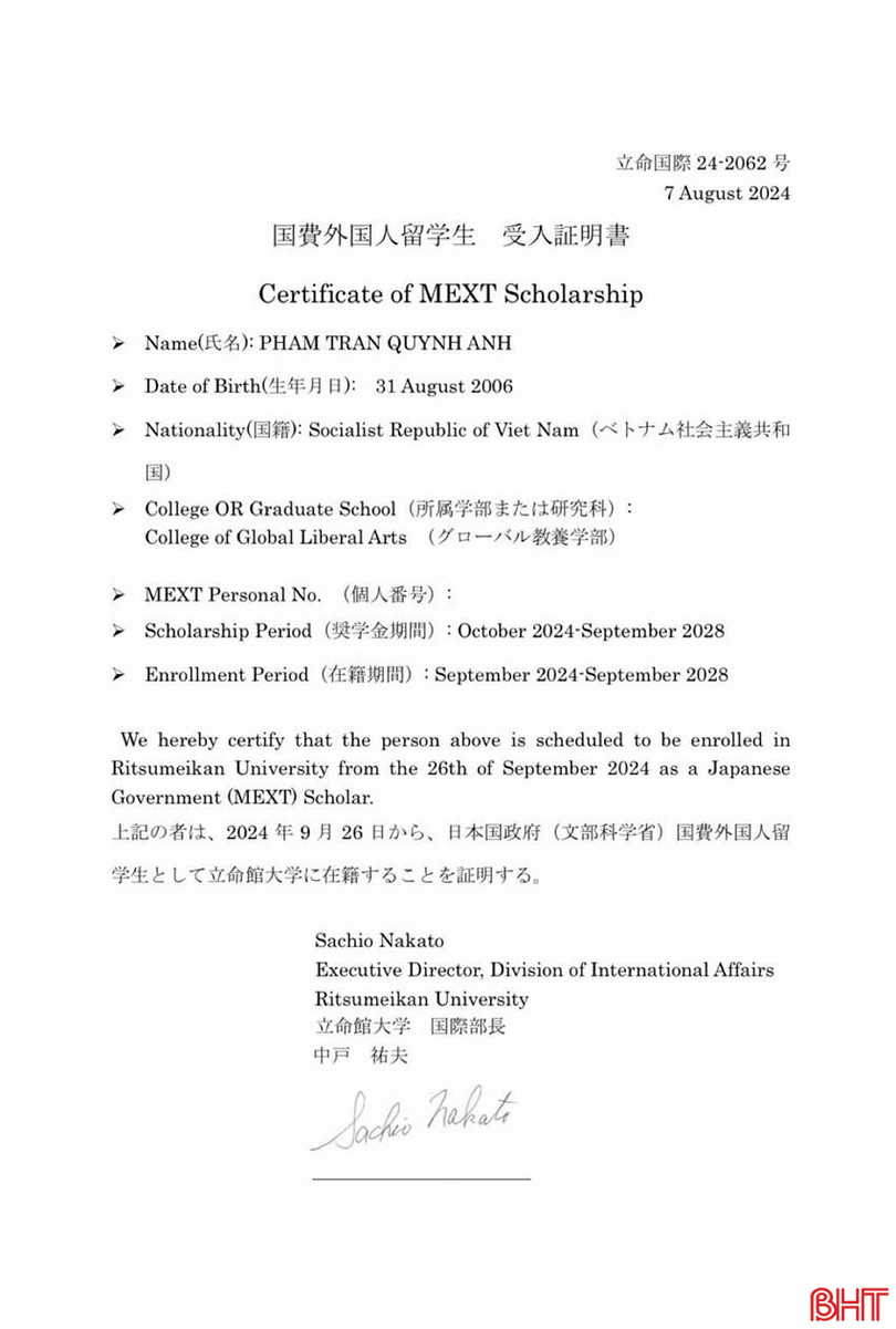 Giấy chứng nhận đạt học bổng Chính phủ Nhật Bản để nhập học vào Đại học Ritsumeikan của Phạm Trần Quỳnh Anh