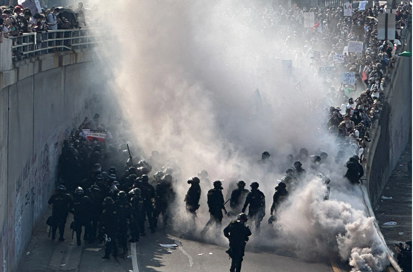 Căng thẳng lên đến đỉnh điểm vào chiều 8/6 khi hàng trăm người biểu tình tụ tập bên ngoài Trung tâm giam giữ Metropolitan ở trung tâm thành phố Los Angeles. Đoạn video cho thấy lực lượng Vệ binh Quốc gia đối đầu với người biểu tình đằng sau khiên chống bạo động.