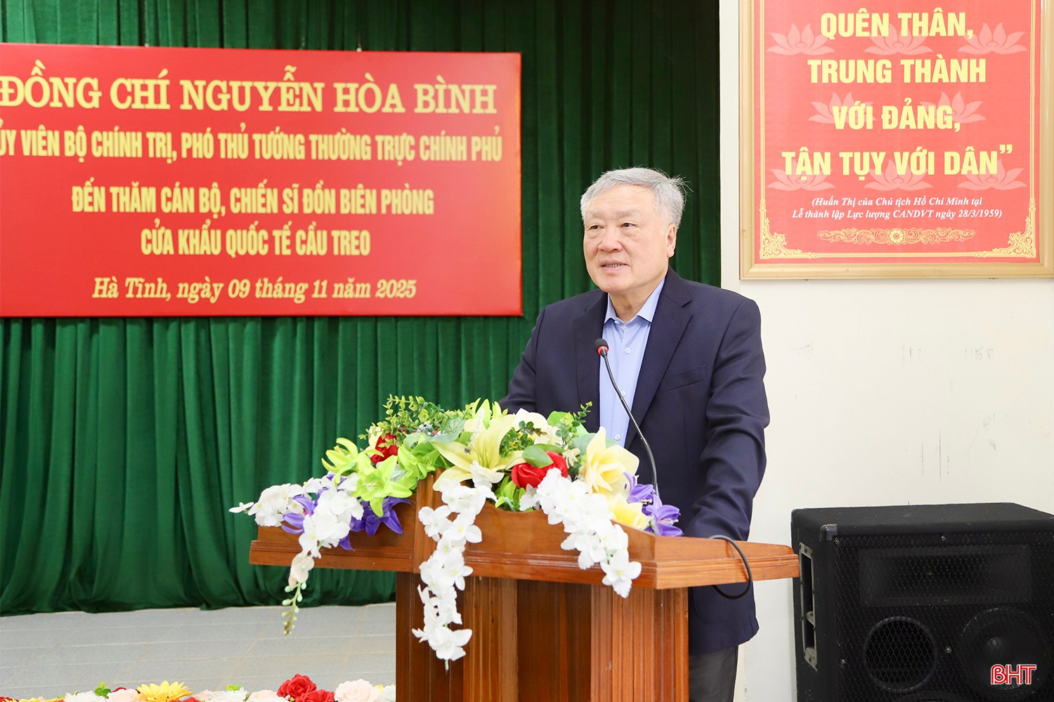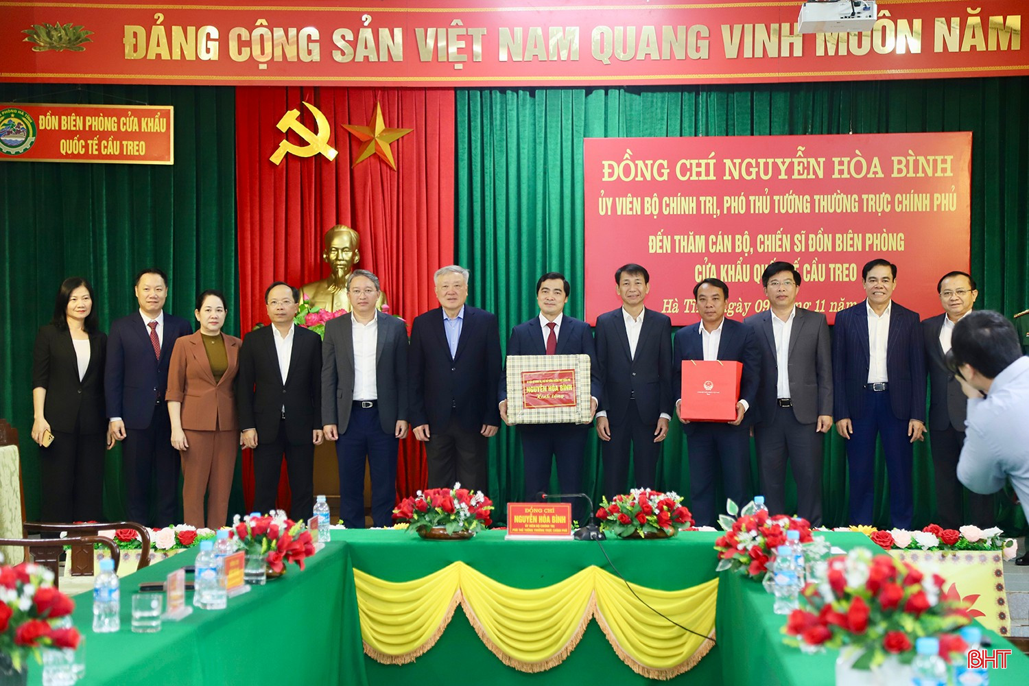 Trong khuôn khổ chuyến công tác tại Hà Tĩnh, sáng 9/11, đồng chí Nguyễn Hòa Bình - Ủy viên Bộ Chính trị, Phó Thủ tướng Thường trực Chính phủ và các đồng chí: Nguyễn Hải Ninh - Ủy viên BCH Trung ương Đảng, Bộ trưởng Bộ Tư pháp; Lê Tấn Cận - Thứ trưởng Bộ Tài chính; Nông Thị Hà - Thứ trưởng Bộ Dân tộc và Tôn giáo đến thăm, tặng quà cán bộ, chiến sĩ Đồn Biên phòng Cửa khẩu Quốc tế Cầu Treo và cán bộ, Nhân dân xã Sơn Kim 1.