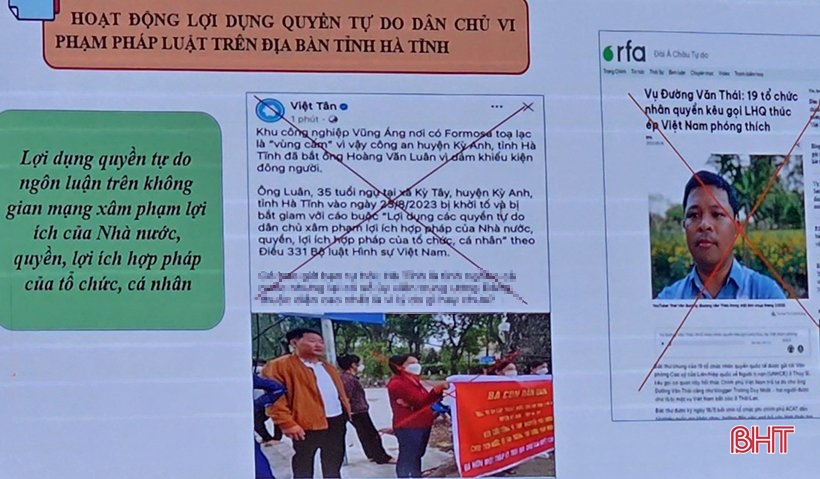 Trong hội nghị tập huấn về công tác nhân quyền tại Hà Tĩnh ngày 12/12/2023, Đại tá Phạm Thanh Phương - Phó Giám đốc Công an tỉnh nhấn mạnh một trong những nhiệm vụ mà Hà Tĩnh sẽ tập trung thời gian tới: Triển khai hiệu quả công tác đấu tranh phản bác các quan điểm sai trái, thù địch, có nội dung xấu độc, vu cáo chính quyền, xâm phạm uy tín, danh dự, quyền, lợi ích hợp pháp của tổ chức, cá nhân, đặc biệt là cán bộ lãnh đạo; xử lý nghiêm minh, kịp thời các đối tượng lợi dụng tự do ngôn luận, tự do báo chí, chiêu bài dân chủ, nhân quyền vi phạm pháp luật trên không gian mạng.