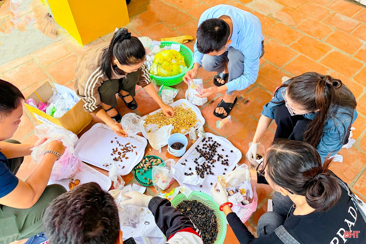 Các thầy, cô trực tiếp tham gia phân loại hạt giống được thu gom từ các em học sinh để chuyển sang Vườn Quốc gia Vũ Quang.