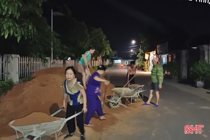 Ban ngày nắng nóng nên người dân thôn Liên Tiến tranh thủ đẩy đất chỉnh trang vườn hộ và đắp lề mở rộng đường vào ban đêm.