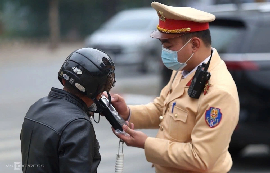 Cảnh sát giao thông Hà Nội kiểm tra nồng độ cồn người đi xe máy chiều 18/1/2023. Ảnh: Gia Chính