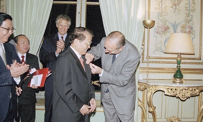 Tổng thống Pháp Jacques Chirac trao tặng Huân chương Bắc Đẩu Bội tinh hạng Nhất cho Chủ tịch nước Trần Đức Lương tại Paris, 28/10/2002. Ảnh: TTXVN