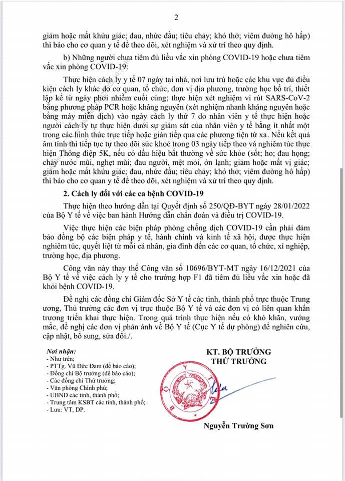 Ngày 21/1, Bộ Y tế ban hành hướng dẫn mới về cách ly y tế đối với F0 và F1. Theo hướng dẫn này, F1 tiêm đủ ít nhất 2 liều vắc-xin phòng COVID-19, liều cuối cùng tiêm trong thời gian ít nhất 14 ngày hoặc đã khỏi bệnh trong vòng 3 tháng tính đến thời điểm được xác định là F1 (có giấy ra viện/giấy xác nhận khỏi bệnh COVID-19) sẽ cách ly 5 ngày tại nhà, nơi lưu trú hoặc các khu vực đủ điều kiện cách ly khác do cơ quan, tổ chức, đơn vị địa phương, trường học bố trí, thiết lập kể từ ngày phơi nhiễm cuối cùng.