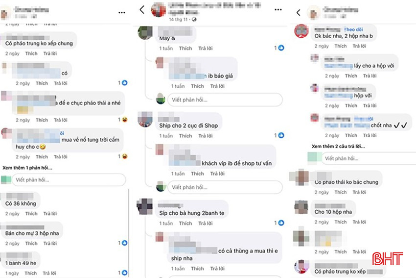 Trên Facebook cá nhân, tài khoản N.T (Cẩm Xuyên) quảng cáo: “Pháo hoa e luôn có sẵn phục vụ khách y nhé”. Còn tài khoản N.T.L (Vũ Quang) vô tư thông tin trên Facebook: “Sáng ni, em Sip pháo khu vực thọ điền và Đức Thọ ai lấy nữa báo em nhé”.