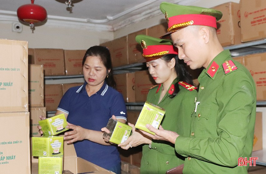 Cán bộ Phòng Cảnh sát QLHC về TTXH (Công an tỉnh Hà Tĩnh) kiểm tra điều kiện kinh doanh tại các cửa hàng pháo hoa Z121 trên địa bàn.