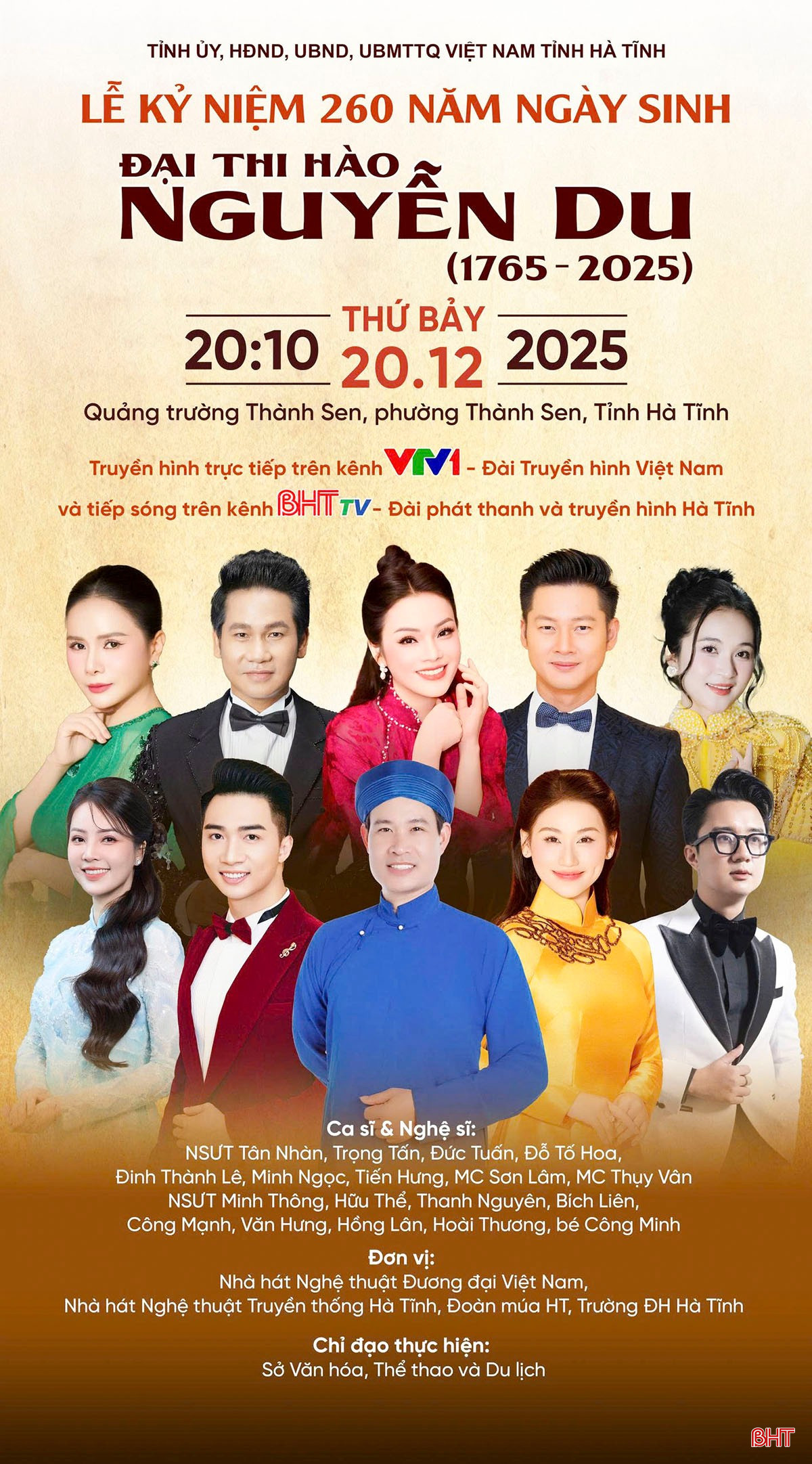 Theo kế hoạch, lễ kỷ niệm 260 năm Ngày sinh Đại thi hào Nguyễn Du sẽ diễn ra vào ngày 20/12/2025. Chương trình kỷ niệm chính thức được tổ chức vào lúc 20h10’ tại Quảng trường Thành Sen (phường Thành Sen), truyền hình trực tiếp trên sóng Đài Truyền hình Việt Nam (VTV), Báo và phát thanh, truyền hình Hà Tĩnh (BHTtv). Trước đó, lãnh đạo Đảng, Nhà nước và tỉnh Hà Tĩnh sẽ tổ chức lễ dâng hương tưởng niệm Đại thi hào tại Di tích Nguyễn Du (xã Tiên Điền).