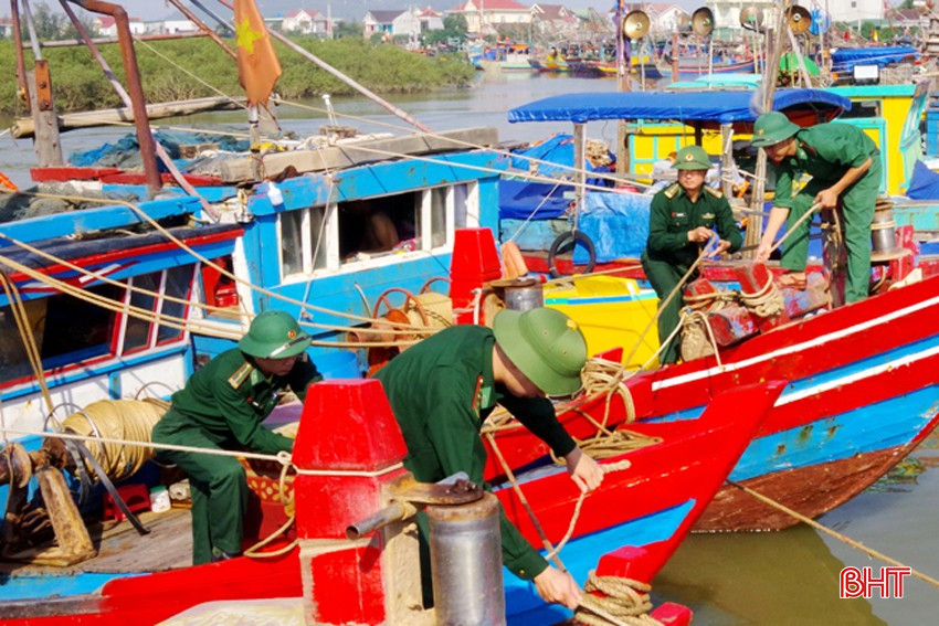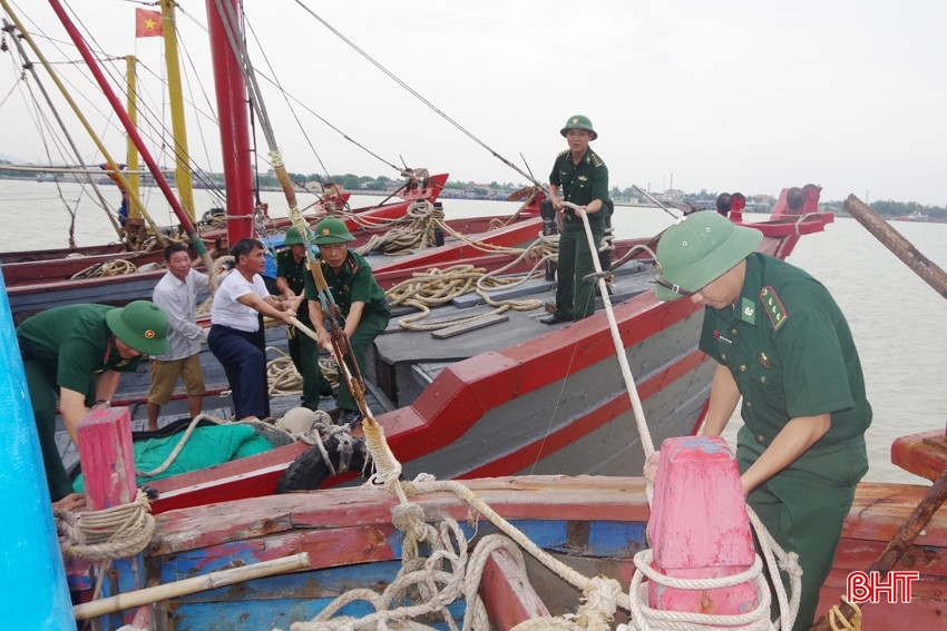 BĐBP Lạch Kèn giúp ngư dân Nghi Xuân giằng néo tàu thuyền để đảm bảo an toàn tại nơi neo đậu khi có mưa bão.