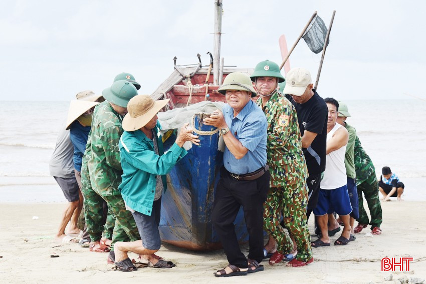Ông Nguyễn Xuân Luận - Bí thư Chi bộ thôn Trung Tiến (đứng trước, phía bên phải) cùng bộ đội biên phòng và bà con ngư dân đưa thuyền lên bờ khi nghe tin có bão lớn.