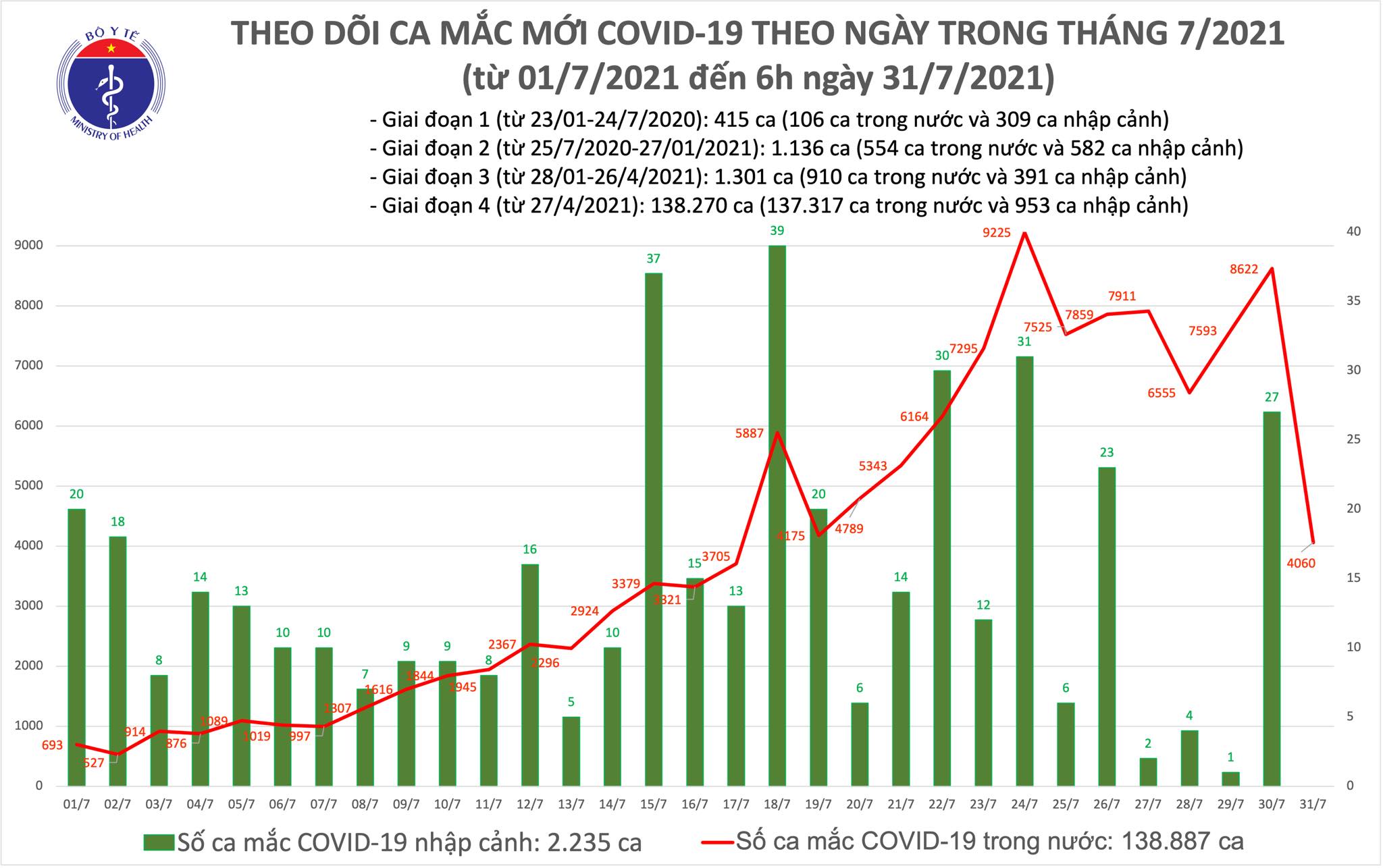 Tính từ 19h ngày 30/7 đến 6h ngày 31/7 trên Hệ thống Quốc gia quản lý ca bệnh COVID-19 ghi nhận 4.060 ca mắc mới ghi nhận trong nước tại TP. Hồ Chí Minh (2.503), Bình Dương (868), Đồng Nai (222), Tiền Giang (123), Bà Rịa - Vũng Tàu (76), Cần Thơ (55), Vĩnh Long (48), Bình Thuận (38), Đồng Tháp (31), Phú Yên (28), Kiên Giang (16), Đắk Lắk (11), Sơn La (10), Bình Định (9), Thừa Thiên Huế (4), Quảng Trị (4), Đắk Nông (4), Hà Nội (3), Nghệ An (2), Hà Tĩnh (2), Hậu Giang (2), Kon Tum (1) trong đó có 973 ca trong cộng đồng.