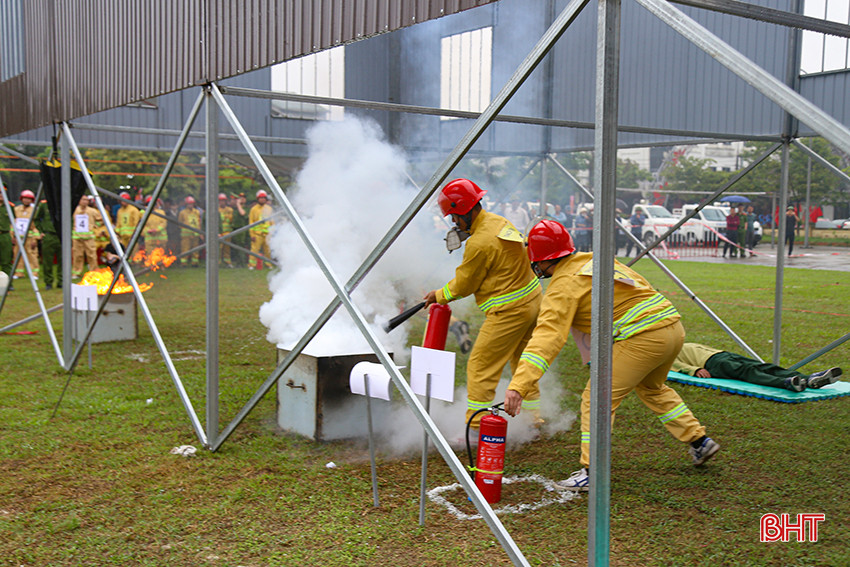 Phần thi thực hành chữa cháy tại Hội thi Nghiệp vụ chữa cháy và cứu nạn, cứu hộ “Tổ liên gia an toàn PCCC” năm 2024 do TP Hà Tĩnh tổ chức.