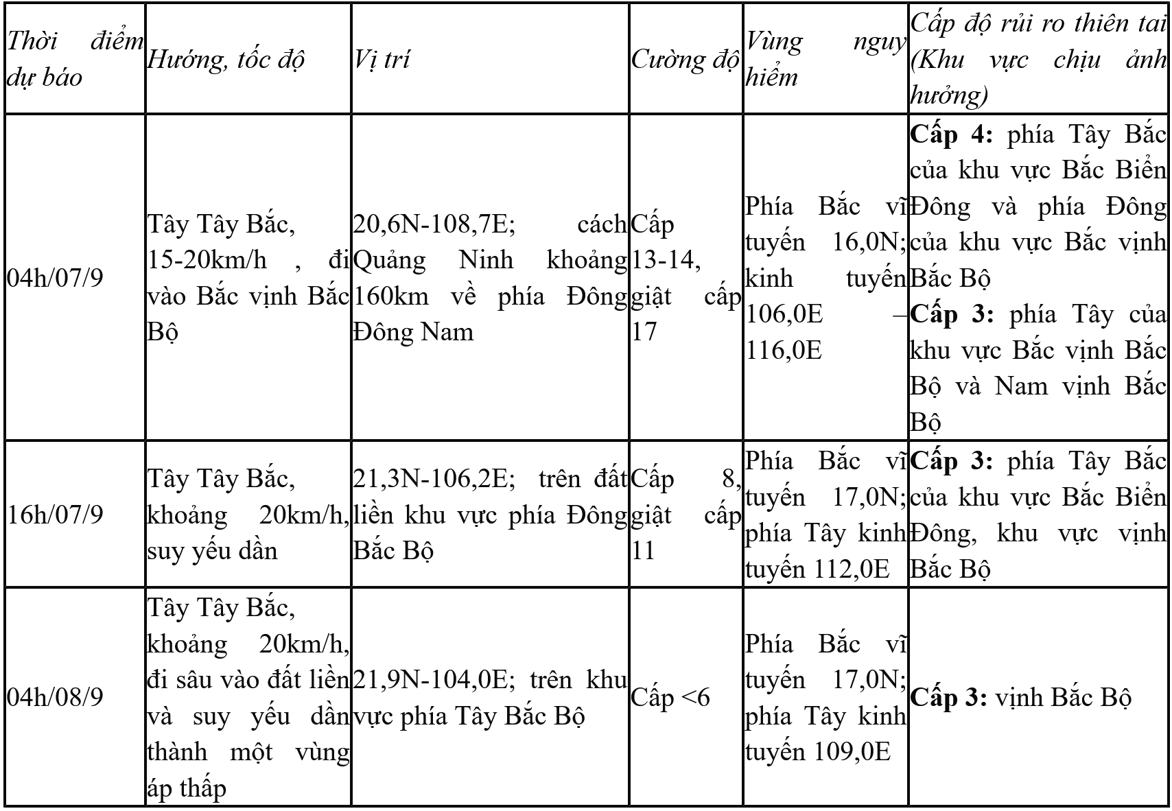 Từ đêm 6/9 đến sáng 9/9, ở khu vực Bắc Bộ và Thanh Hoá có khả năng xuất hiện một đợt mưa to, cục bộ có nơi mưa rất to và dông với tổng lượng mưa phổ biến từ 100-350mm, có nơi trên 500mm (mưa lớn nhất ở phía Đông Bắc Bộ tập trung trong ngày và đêm 7/9; phía Tây Bắc Bộ từ tối ngày 7/9 đến đêm 8/9). Mưa lớn có khả năng gây ra tình trạng ngập úng tại các vùng trũng, thấp; lũ quét trên các sông, suối nhỏ, sạt lở đất trên sườn dốc.
