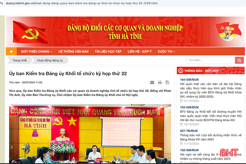 Thông tin kỳ họp xem xét thi hành kỷ luật đảng đối với tổ chức đảng và đảng viên đều được công khai trên Trang thông tin điện tử của Đảng bộ Khối.