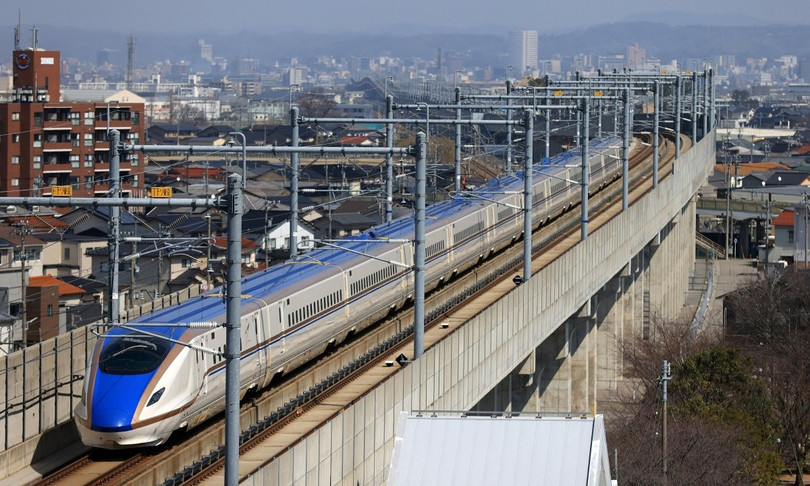 Đoàn tàu cao tốc di chuyển qua thành phố Hakusan, tỉnh Ishikawa, Nhật Bản, hôm 16/3/2024. Ảnh: AFP