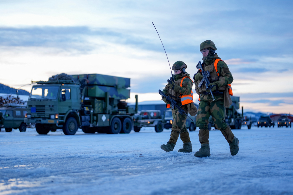Binh sĩ Na Uy di chuyển qua các phương tiện chở thiết bị quân sự chuẩn bị được đưa lên tàu ở cảng Orkanger ngày 4/12. Ảnh: AFP